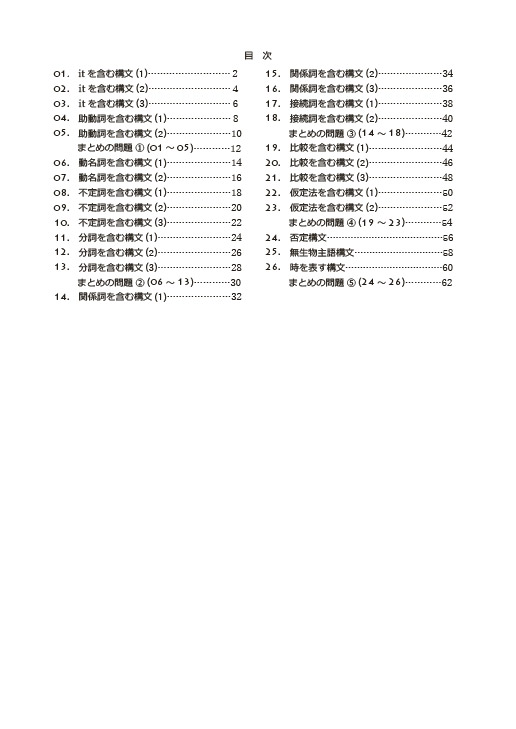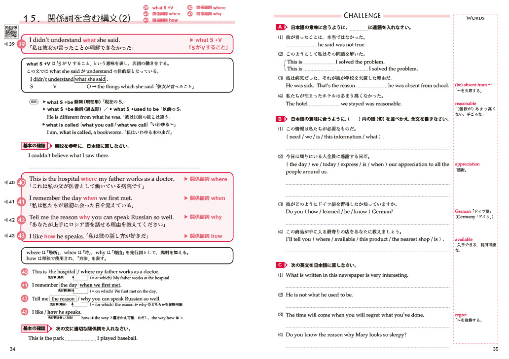 見開き2頁 左頁…基本例文・解説、右頁…演習問題