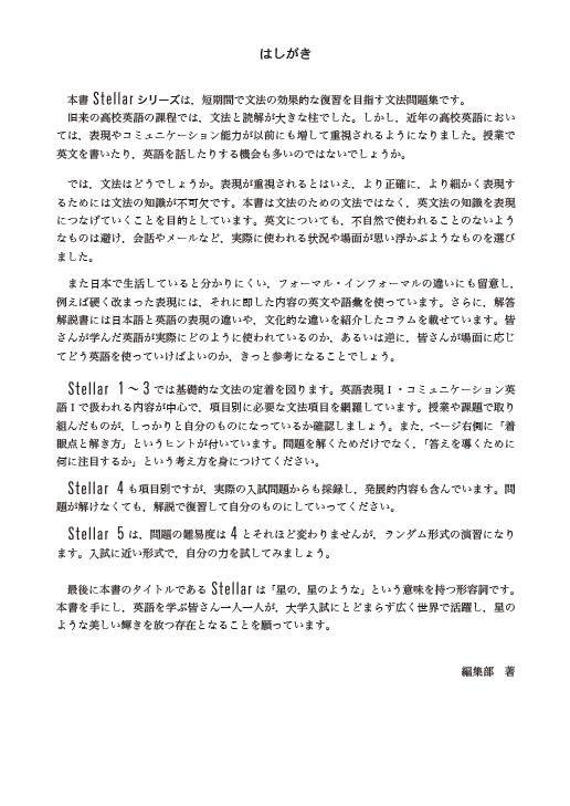 Stellar 1 ステラ 表現や読解に必要な文法の知識を養うドリル。 問題の英文は現代英語表現を意識して厳選。 項目別で文の種類~助動詞まで収録。 教師用データCDにはまとめのテスト収録。 製品仕様 ■本誌 B5判 32頁 ■解答解説書 32頁(無料) ◇本誌と別梱包で納品 定価 440円(本体 400円+税) 別売品 音声CD 定価 110円(100円+税) 付属品 ◆生徒用付属品 ・解答解説書 ◆教師用付属品 ・音声CD ・解答解説書 ・データCD