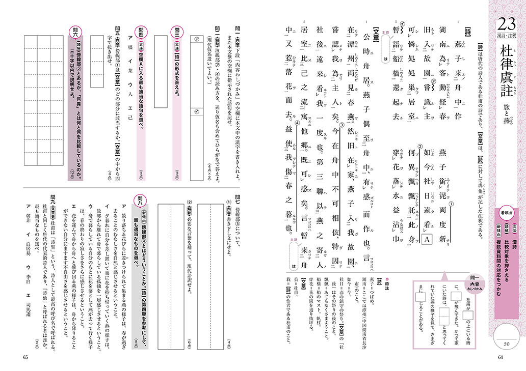 ―類似テーマの文章との読み比べ、生徒のノートや感想文、会話を用いた問題をはじめ、和歌・現代文・訳文を絡めた問題まで、バラエティに富んだ新傾向問題に取り組むことができます。